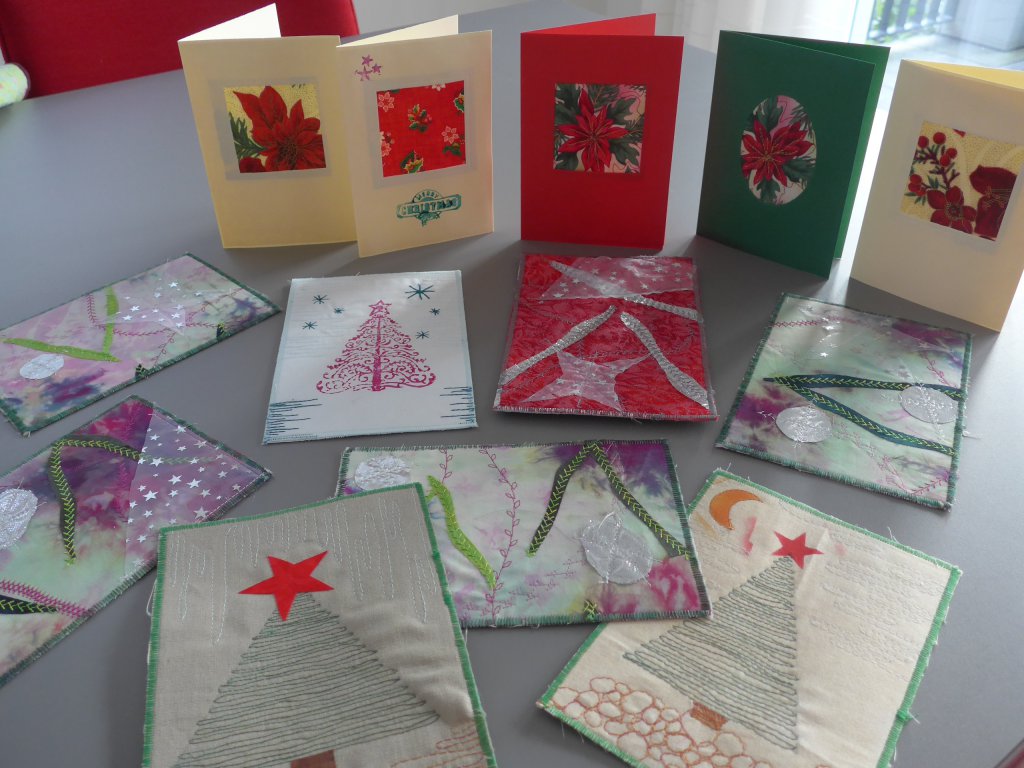 Ook dit jaar heb ik weer enkele kerstkaarten zelf gemaakt. Elk jaar neem ik me voor wat vroeger te beginnen en elk jaar mislukt dat, zodat ik geen tijd heb om ze allemaal zelf te maken. Sommige heb ik heel simpel gehouden, een stukje kerststof doorgequilt en in een kaart geplakt, van andere heb ik wat meer werk gemaakt.