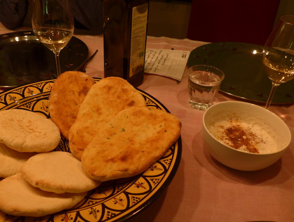 Het voorgerecht op Kerstavond was zelfgebakken naanbrood met humus en yoghurtdip. De humus had Martijn gemaakt, zoveel dat we er nog dagen van konden eten!