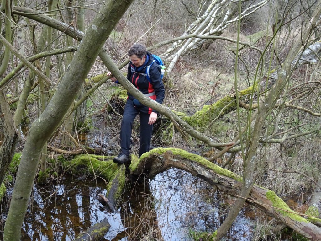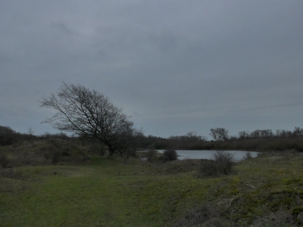 Afgelopen zaterdag waren de georganiseerde tochten iets te ver weg naar onze zin, daarom besloten we zelf een wandeling te doen, een stukje Voornepad van Rockanje naar Oostvoorne en weer terug. Helaas stonden niet alle bordjes er zodat we nogal eens moesten gokken. Ik denk dat ze de bordjes in de winter weghalen omdat het dan op sommige stukken te drassig is. We moesten dan ook herhaaldelijk via omgevallen bomen e.d. ons pad vervolgen en op een gegeven moment konden we echt niet meer verder, hier stond het water te hoog en we konden er ook niet omheen.