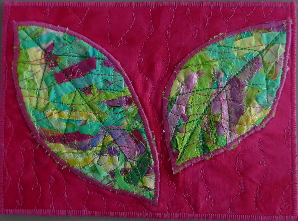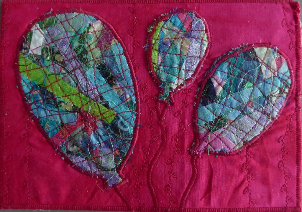 De kleinste snippertjes stof zijn nog bruikbaar. Voor deze kaarten heb ik eerst allerlei kleine snippertjes op een lapje gelegd, ook wat draadjes en angelina ertussen, over het geheel een stukje soluvlies en daarna met de naaimachine doorgestikt zodat alles goed vast kwam te zitten.
