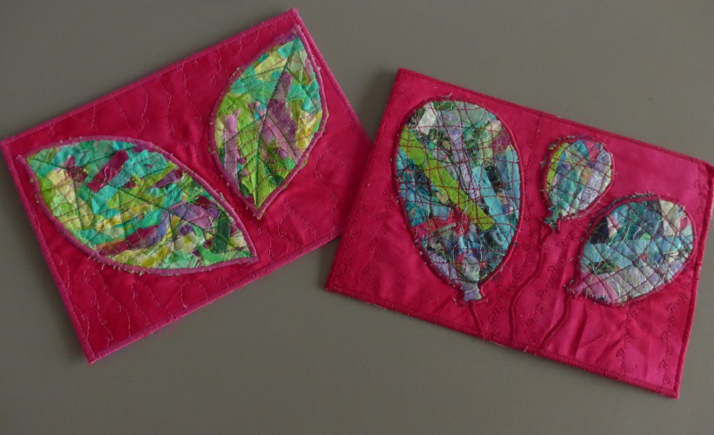 Vervolgens het geheel onder de warme kraan gehouden om het soluvlies te laten oplossen. Na droging heb ik wat vormen geknipt en deze weer op een ondergrond gestikt. Daarna heb ik er kaarten van gemaakt.