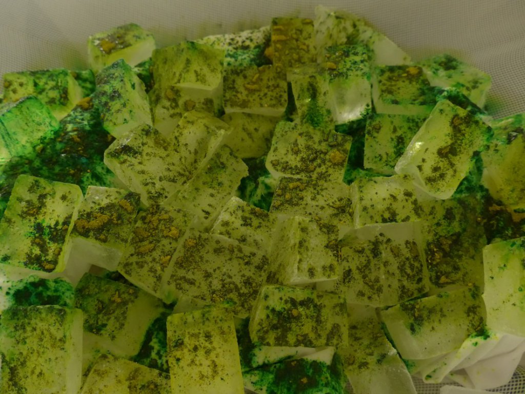 Ik heb eerst een stuk vitrage over een grote plastic bak gespannen en hierop een flinke lap natte stof gelegd, eerst in een soda-ash oplossing geweekt en daarna in elkaar gevouwen. Hierop een laag ijsklontjes en er toen diverse mengsels verfpoeder over gestrooid. Ik heb citrien en turquoise in verschillende verhoudingen gebruikt en een klein beetje azuriet van Procion MX. Daarna heb ik de hele boel afgedekt met een plastic vuilniszak en 24 uur laten staan. En dit is het resultaat geworden: