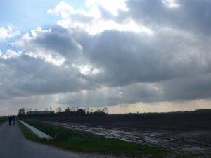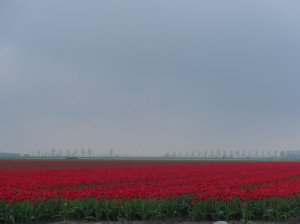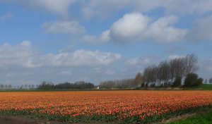 Dit was vlak na de start, de zon probeert hier door te breken. Al na ongeveer 1 km kwam ik Adriaan tegen met wie ik bijna de hele tocht heb gelopen, gezellig. Vooral in het begin zagen we veel tulpenvelden, het laatste stuk eigenlijk niet meer. We hadden verschillende rusten, de eerste bij de boerderij van Wesdorp, daarna bij café de Tram waar we alleen gestempeld hebben en daarna bij manege de Oostmoer waar ik een boterham heb gegeten. Traditiegetrouw kreeg je weer een pannenkoek bij de stempelpost in Stad a/h Haringvliet en daarna was het nog 5,5 km tot de finish. De tocht was weer prima georganiseerd en duidelijk gepijld. Na afloop heb ik nog een paar bossen tulpen gekocht en toen weer op de fiets naar huis, fijn als een tocht zo dichtbij is.
