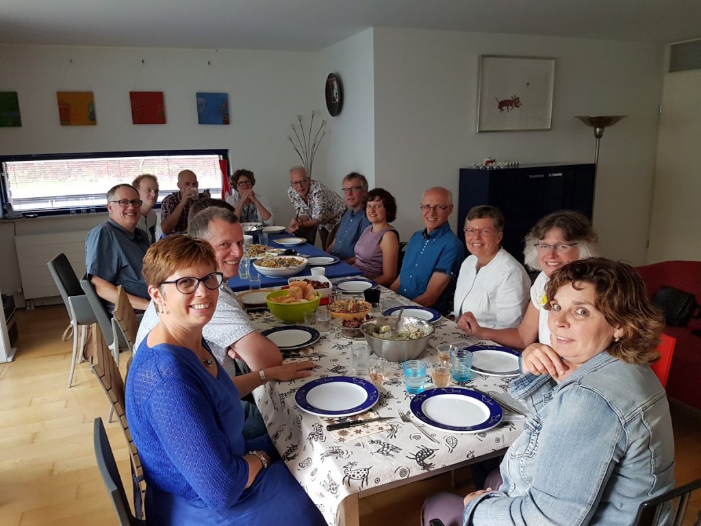 Hierna was de receptie bij Rietland in Zuidwolde waar we natuurlijk getrakteerd werden op een heerlijk stuk ijstaart, hoe kan het ook anders als je een ijssalon hebt. Het was een heel gezellige bijeenkomst met volop lekkere hapjes en drankjes. Na afloop gingen we naar buiten voor een groepsfoto en gelukkig was het toen droog. Op de terugreis begon de zon zelfs te schijnen. Het was heel fijn dat we met z’n allen bij zus Lia in Utrecht konden eten, we waren toen al over de helft.