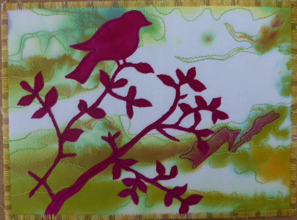 De ondergrond van beide kaarten is een geverfd lapje wat ik met de machine heb gequilt en daarna heb ik de vogels er met vliesofix opgestreken en ook weer met de machine vastgenaaid.