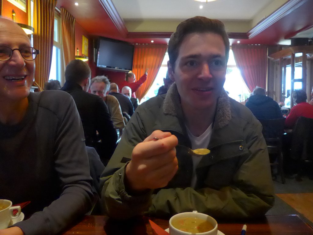 Bij het Flaauwe Werk gingen we de dijk weer op en in het restaurant van Toppershoedje zat de laatste stempelpost op 33 km. Nu was het nog maar een klein stukje voordat we ons konden afmelden rond half 3, de teller stond op 35,5 km. Er hadden in totaal voor alle afstanden meer dan 800 mensen meegedaan, waarvan 77 aan de 35 km, gelukkig was er nog genoeg erwtensoep en hebben we heerlijk zitten genieten.