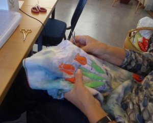 Bij deze techniek worden de randjes niet afgewerkt, dus moet je zorgen voor stoffen die niet erg rafelen. Je kan diverse lagen stof onder je bovenkant leggen of een patchworklap die je van tevoren hebt genaaid, je weet dan niet precies wat er tevoorschijn komt.
