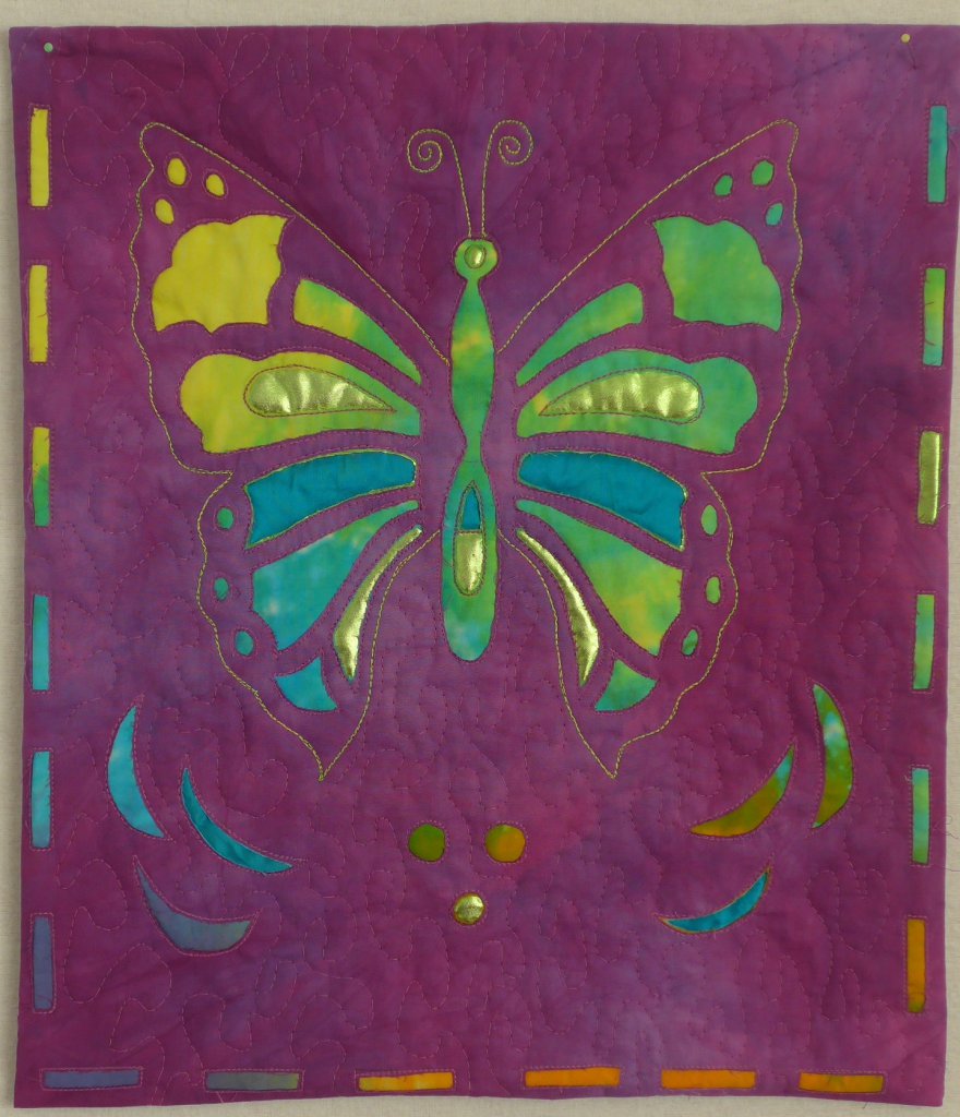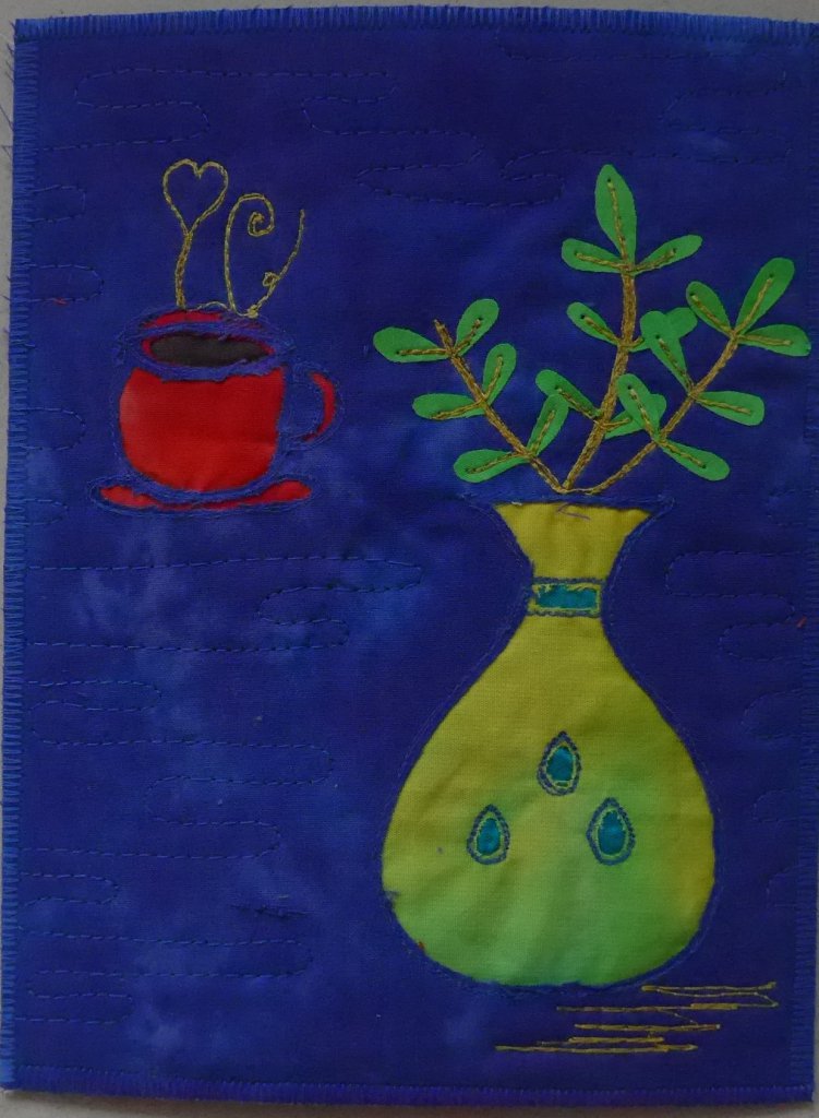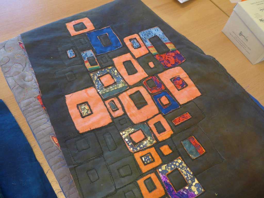 Een paar weken geleden gaf Toos, één van de leden van onze quiltgroep “de Torenquilters” een workshop reverse appliqué. Ze had zelf wat voorbeelden meegenomen en iedereen ging ijverig aan de slag met tekenen, naaien en knippen. Dit is een voorbeeld van Toos: