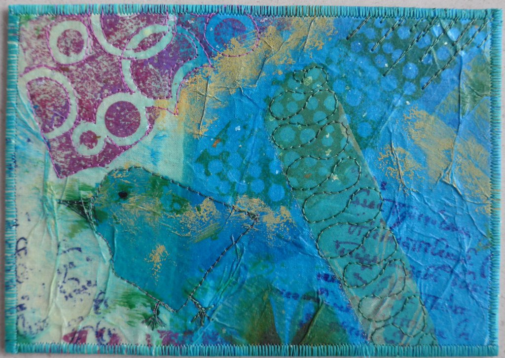 Voor Kerst en Nieuwjaar heb ik dit jaar helemaal geen kaarten gemaakt, maar nu ben ik weer begonnen. Ik had nog wat stukjes fabric paper liggen en deze heb ik nog wat bewerkt en er 2 kaarten van gemaakt. Op de blauwe zag ik een vogeltje en dit heb ik met steken geaccentueerd.