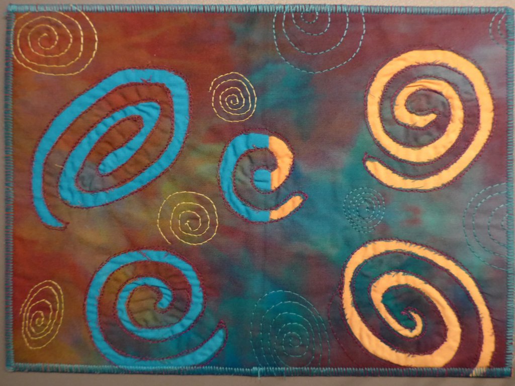 Deze kaart maakte ik weer met de reverse appliqué techniek, dit keer met spiralen.