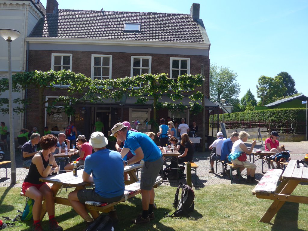 ‘ s Middags eerst even naar de Catharinakerk om het startbewijs voor de eerste dag op te halen, hier was het al gezellig druk en we kwamen zowaar een bekende tegen. De volgende ochtend startten we even voor 8 uur voor de tocht van 30 km. Deze voerde ons o.a. naar Zelhem, leuk was dat we sommige stukken herkenden van het Pieterpad waar we vorige maand nog hadden gelopen. Het was heerlijk wandelweer en er was regelmatig gelegenheid om te rusten en wat te eten en drinken, nergens stonden lange rijen, ook niet bij de toiletten.
