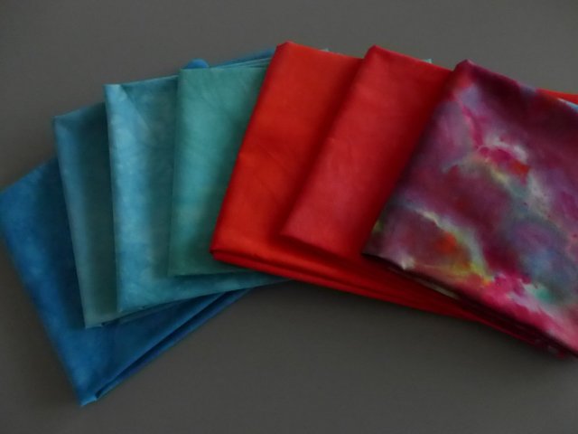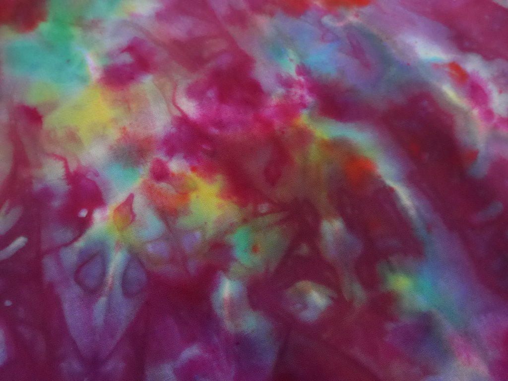 Het mooie weer van de afgelopen week nodigde uit om lapjes te gaan verven. Ik had nog een bepaalde kleur blauw nodig en ook rood kan ik nog wel gebruiken. De restjes verf heb ik over een lapje verdeeld wat dit leuke resultaat opleverde: