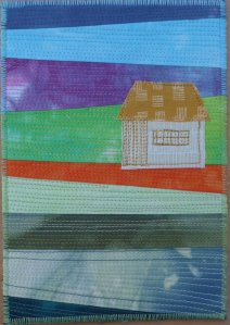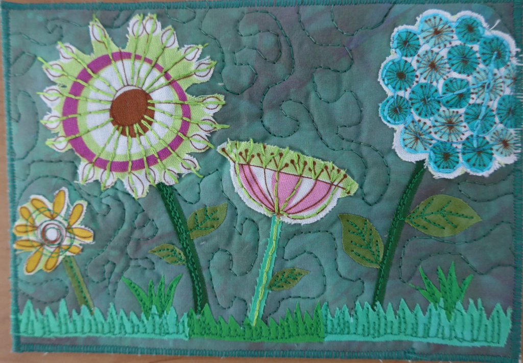De kaarten waaraan ik op vakantie begonnen was heb ik afgemaakt en nog een paar nieuwe kaarten gemaakt. Bij deze kaart heb ik bloemen uit een lapje geknipt en deze met borduursteken en quiltsteken op een ander lapje genaaid.