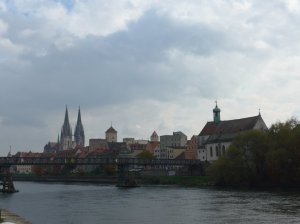Voor onze verjaardagen hadden we van Derk en Natasha een heel mooi cadeau gekregen: een weekend naar München! Vrijdagavond vlogen we vanaf Schiphol, we hadden de auto bij Barendrecht geparkeerd en waren vandaar met de trein gegaan, lekker makkelijk. Bij Barendrecht kan je goed en gratis parkeren en het scheelt je gezoek op Schiphol. Derk haalde ons op van het vliegveld en rond 10 uur waren we bij zijn appartement. Natasha had heerlijke Braziliaanse kaasbroodjes gebakken: Pão de queijo. Ze smaakten prima na de lange reis en we hadden nog een paar gezellige uurtjes voordat we ons bed opzochten. De volgende morgen was het mooi weer en reden we naar Regensburg. Hier hebben we heerlijk geslenterd door de oude binnenstad en langs de Donau, het was prachtig met de mooie historische gebouwen, de gekleurde huizen en de herfstkleuren van de natuur. Het was zulk lekker weer dat we zelfs op een terrasje konden zitten.