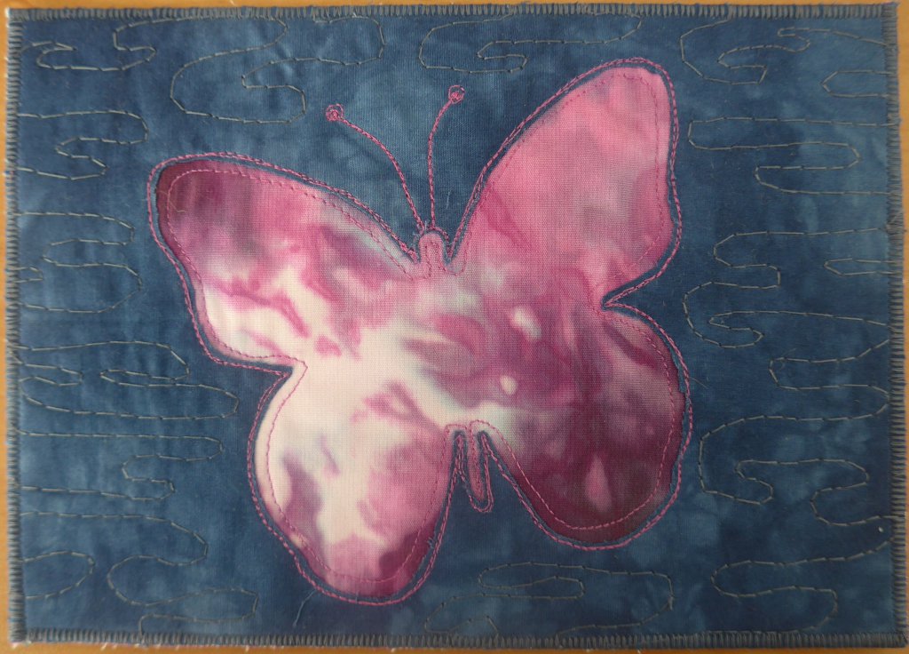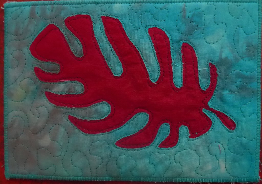 Reverse appliqué vind ik leuk om te doen en ik maakte er weer twee kaarten mee. Bij de eerste kaart had ik de kleuren precies andersom gepland maar bij het op elkaar leggen van de stofjes is er iets verkeerd gegaan wat ik pas merkte toen ik de stof ging wegknippen. Maar goed, zo is hij ook leuk geworden.