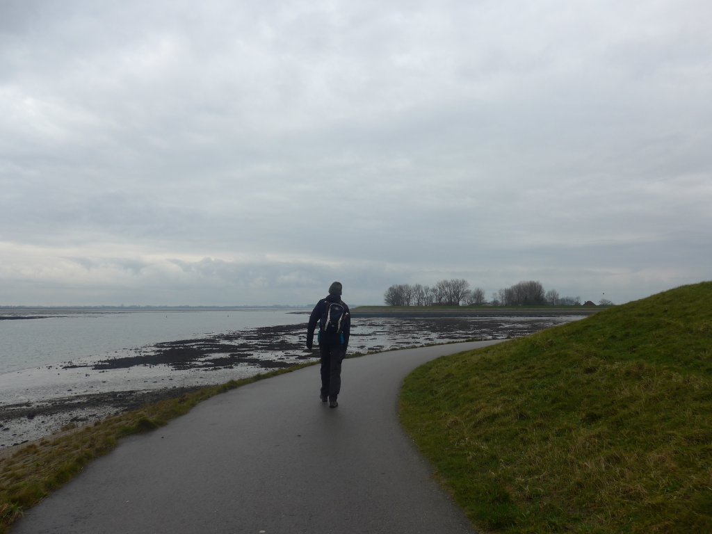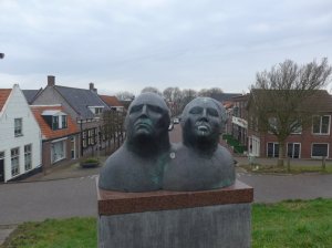 We hadden de tocht zo gepland dat we ongeveer op de helft door Sint Philipsland kwamen waar we dan een bakje zouden kunnen drinken, maar helaas was het enige café nog gesloten. Toen maar even op een bankje in de Voorstraat onze koek opgegeten en daarna snel weer verder voordat we te koud werden. De gele molen van Sint Philipsland en het beeld bovenaan de dijk met onderaan de Voorstraat met rechts het café wat dus gesloten was.
