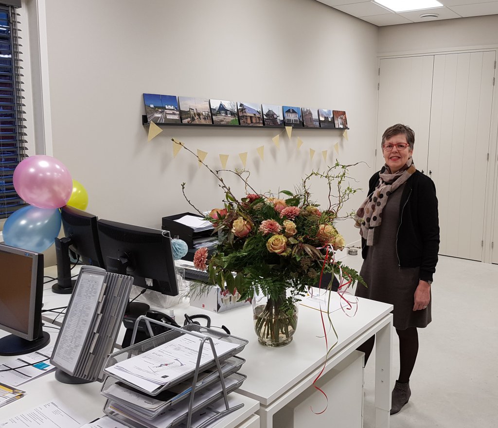 In die 25 jaar heb ik heel wat meegemaakt, o.a. overname van het bedrijf door de zoons en vorig jaar zijn we nog verhuisd naar een prachtig nieuw kantoor. Toen ik begon was het kantoor nog in het woonhuis, later werd de oude werkplaats verbouwd tot kantoor en nu heb ik echt alle ruimte. Ook heb ik diverse timmermannen en metselaars zien komen en gaan, al is het verloop niet erg groot, er zijn er meer die al 25 jaar in dienst zijn en 1 timmerman is eind van dit jaar zelfs 50 jaar in dienst! Ik heb altijd 3 ochtenden per week met veel plezier gewerkt en voorlopig blijf ik dat nog even doen, al heb ik al wel een idee over wanneer ik ga stoppen.