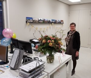 Gisteren werkte ik 25 jaar bij aannemersbedrijf Wielhouwer en dat werd gevierd! Het kantoor was versierd en er stond een geweldig grote bos bloemen klaar. Van de bazen kreeg ik een mooi bedrag waarmee ik heel wat leuks kan doen, om te beginnen ga ik een smartphone kopen want die had ik nog niet voor mezelf. En van de rest kunnen we er samen nog een paar dagen op uit. Half tien kwam Aat ook naar kantoor en kwam er een enorme doos met gebakjes, allemaal met mijn naam en 25 erop. Het personeel kwam ook een gebakje halen en van hen kreeg ik cadeaubonnen en een bloemetje. Al met al een heel leuke verrassing, ik was er gewoon beduusd van.