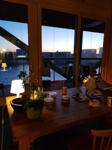 Daarna hebben we iets gegeten in het nieuwe appartement waarna we weer naar huis zijn gereden. Het appartement is nu nog vrij leeg, het is flink wat groter dan hun vorige huis, maar ze nemen rustig de tijd om het in te richten. Je kijkt uit over een kanaal en daarachter ligt het IJ, een leuk gezicht zo ‘s avonds.