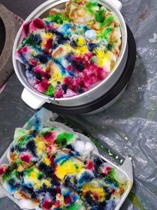 En met die lekkere laag sneeuw zaterdag moest ik natuurlijk sneeuwverven! Het deel met gaatjes van de rijstkoker kwam weer goed van pas, hier heb ik twee lapjes op gelegd, een beetje verfrommeld. Daarop een flinke laag sneeuw en vervolgens diverse kleuren verfoplossing erover. Ook heb ik nog een bakje gebruikt waarover ik vitrage heb gespannen, jammer genoeg zakte dat een beetje in door het gewicht van de sneeuw en kwam het lapje gedeeltelijk in het lekwater te liggen. Daar moet ik nog eens wat anders op verzinnen, maar voorlopig zal het wel niet meer gaan sneeuwen.