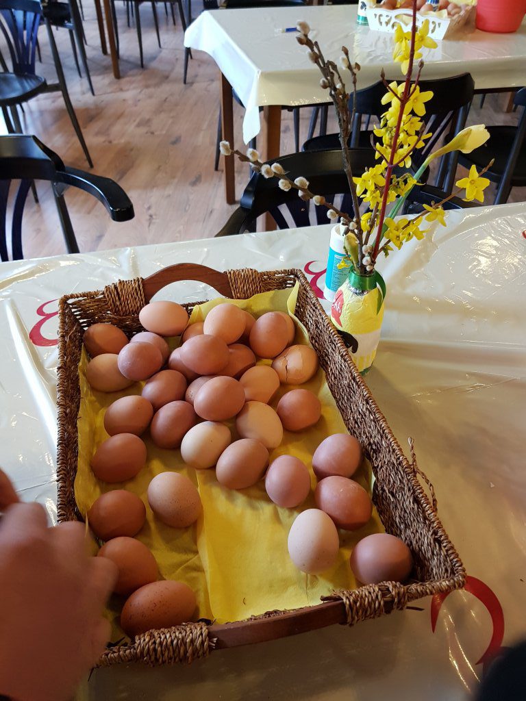 Zondag zijn we eerst naar de kerk geweest en hebben daarna rustig aan gedaan, het weer was een stuk minder. Vandaag zou het ook gaan regenen maar we wilden toch weer een wandeltocht maken en zijn hiervoor naar Meeuwen gereden. De heenweg zat een beetje tegen vanwege een gekantelde vrachtwagen, we zouden een heel stuk om moeten rijden maar besloten toen de veerpont bij Sprang-Capelle te nemen. Hierna was het nog een paar kilometer naar Meeuwen waar we een half uur later dan gepland aankwamen. Op de tafels stonden manden met heel veel gekookte eieren voor de wandelaars.