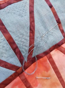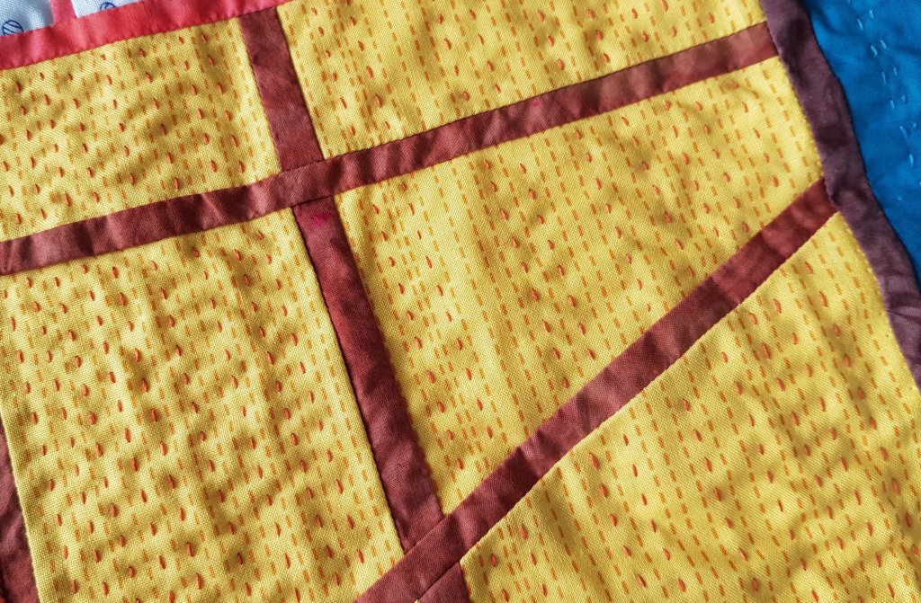 Voor de tentoonstelling van volgend jaar van de Torenquilters ben ik bezig met een groot werkstuk van 100 bij 190 cm. Omdat zo’n groot stuk lastig te quilten is doe ik dit per baan met alleen een laag katoen erachter. Sommige stukken met de hand met borduurzijde of quiltgaren, andere stukken machinaal. Daarna zet ik de banen aan elkaar, bevestig de tussenvulling en achterkantstof en quilt dan het geheel met grote lijnen door. Met het mooie weer van de laatste tijd doe ik het handwerk lekker buiten.