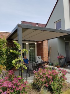 Eerst alle deuren van de auto een tijdje opengezet, het leek wel een oven daarbinnen! Thuis gekomen konden we weer verder genieten van het prachtige weer onder ons nieuwe afdak, geplaatst door Tuin en Ontwerp.