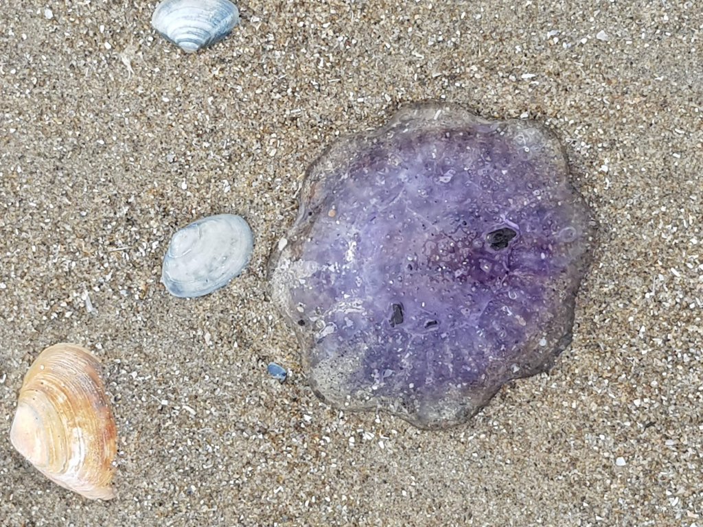 net nog te vroeg voor de Halve Maan, dus besloten we eerst nog een stuk over het strand te lopen. Dit liep behoorlijk zwaar door het zand en we zagen veel kwallen. Verder was het erg rustig, terwijl het toch heerlijk weer was.