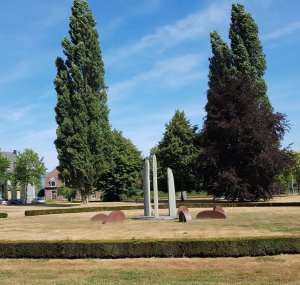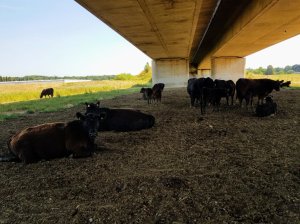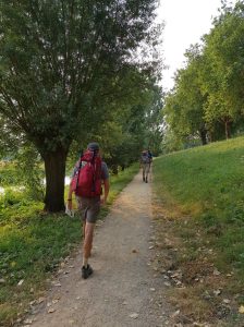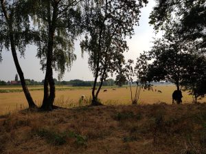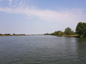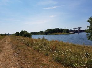 Het leek af en toe wel of we door de duinen liepen met al dat zand! In Swolgen logeerden we bij een aardige mevrouw via Vrienden op de Fiets, bij wie we ook konden eten, gezellig in de tuin onder de parasol. ’s Nachts bleef het erg warm, later las ik dat het de warmste nacht ooit gemeten was, dus van slapen kwam er weer niet veel. We konden gelukkig al om 7 uur ontbijten zodat we vroeg op stap konden gaan. Het was inmiddels vrijdag geworden en de warmste dag van de hele vakantie, ’s middags liep de temperatuur op tot 37 graden, niet echt leuk als je stukken hebt zonder schaduw! ’s Morgens liepen we nog veel door het bos, maar ’s middags helaas niet meer, vooral het stuk langs de Maas richting Venlo was een kwelling. De koeien hadden beschutting gezocht onder het viaduct. Ik werd weer misselijk en moest geregeld een tijdje stoppen. Je kreeg ook nergens de gelegenheid een beetje af te koelen, overal was het warm, als je je na het douchen aankleedde begon je alweer te zweten. ’s Avonds hebben we heerlijk gegeten bij Hemingway. We hadden een kamer in een mooi herenhuis, het Venlo’s Plekje, jammer dat de buren de hele nacht aan het kletsen waren in de tuin zodat er weer niet veel van slapen terecht kwam.