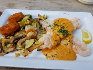 Aat had zalm en vanwege de warmte koos ik een heerlijke Ceasarsalade. Daarna hebben we nog een stukje gelopen en een tijdje op een bankje gezeten. We hoorden vreemde geluiden van bovenaf komen en toen we omhoog keken zagen we ooievaars op de toren, die flink aan het klepperen waren.
