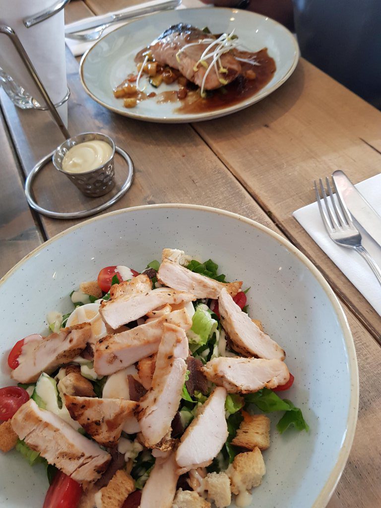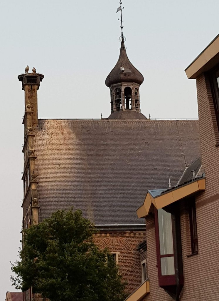 Aat had zalm en vanwege de warmte koos ik een heerlijke Ceasarsalade. Daarna hebben we nog een stukje gelopen en een tijdje op een bankje gezeten. We hoorden vreemde geluiden van bovenaf komen en toen we omhoog keken zagen we ooievaars op de toren, die flink aan het klepperen waren.