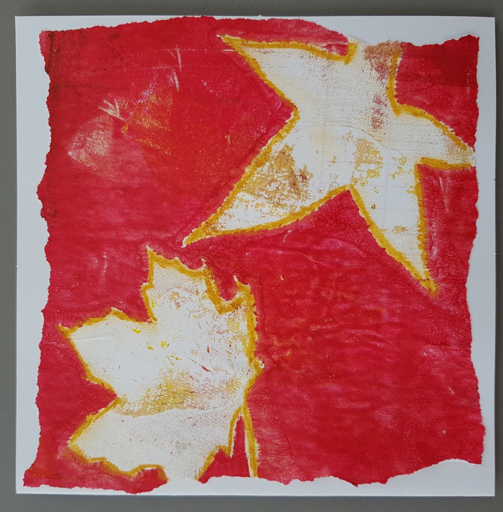 Deze heb ik ook opgeplakt, gemaakt met echte bladeren als masker en de omtrek geaccentueerd met oliekrijtjes.
