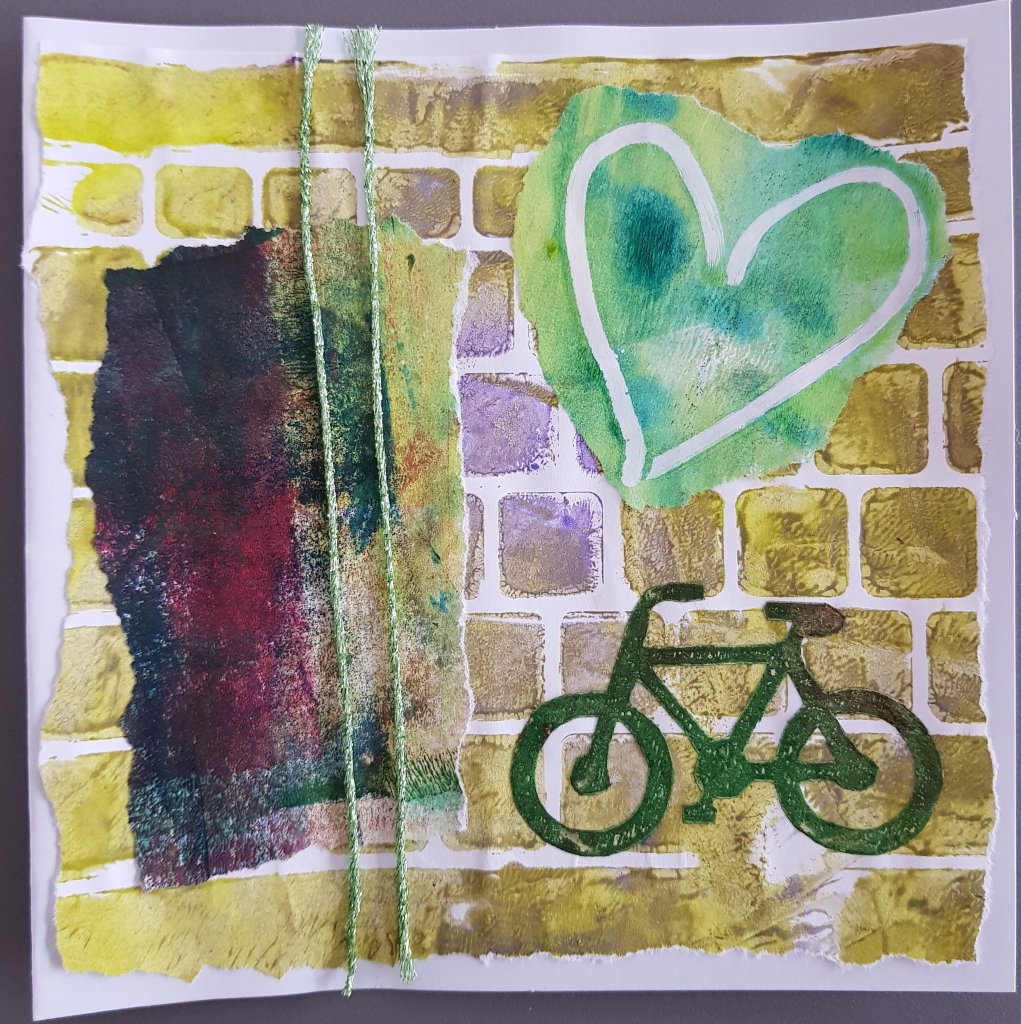 Dit is een collage van verschillende prints met het fietsje wat ik op een vorige kaart als masker gebruikt heb.