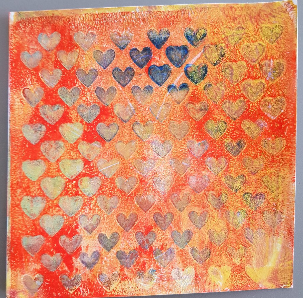 De eerste heb ik rechtstreeks op de kaart geprint, de tweede op een vel papier en dit geplakt op een kaart, ik vind het leuk om de randjes dan te scheuren. De volgende is weer rechtstreeks op de kaart geprint, waarbij ik een hartjesstencil heb gebruikt.