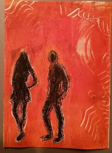 Ook in 2019 ben ik weer kaarten aan het maken. Deze zijn met de gelli plate gemaakt. Van een kennis kreeg ik wat uitgestanste figuren, een paar figuurtjes heb ik gebruikt voor deze kaart voor een stel dat gaat samenwonen.