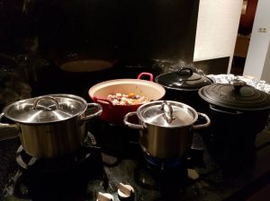 Als hoofdgerecht hadden we drie stoofpotten, één met rundvlees, één met kip en één met vis en daarnaast pasta, couscous, een schaal met groenten en een aardappelschotel. Het was druk op het fornuis en in de oven!
