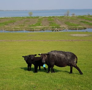 Aat was een beetje stijf na de Kennedymars, dus besloten we vanmiddag een stukje te gaan lopen, dat helpt altijd. We zetten de auto bij de haven van den Bommel en liepen eerst een stuk langs het Haringvliet met veel schapen en schattige lammetjes, wit en zwart.