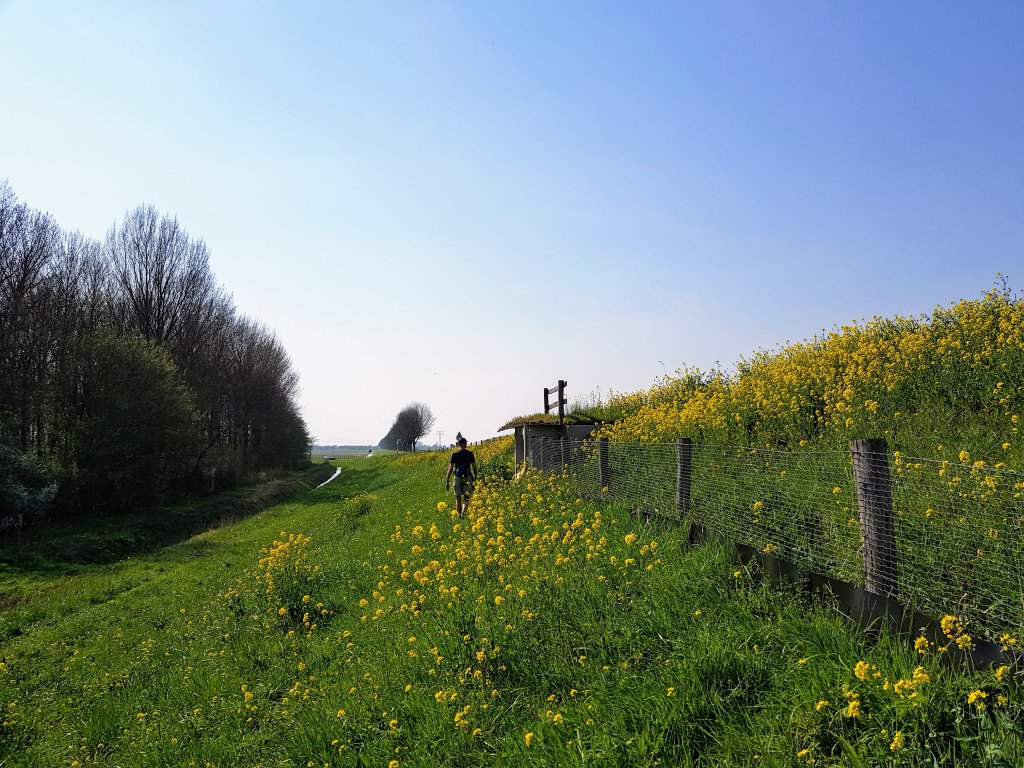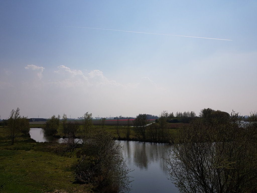 Het was heerlijk weer, we liepen met blote armen en halverwege ritste Aat zelfs zijn broekspijpen af. We liepen via het schapentunneltje naar het natuurgebied het Groote Gat en daarna weer ongeveer dezelfde weg terug, totaal zo’n 12 km. Als je de foto vergroot zie je in de verte een tulpenveld, hopelijk bloeien de tulpen nog met de tulpentocht over 2 weken.