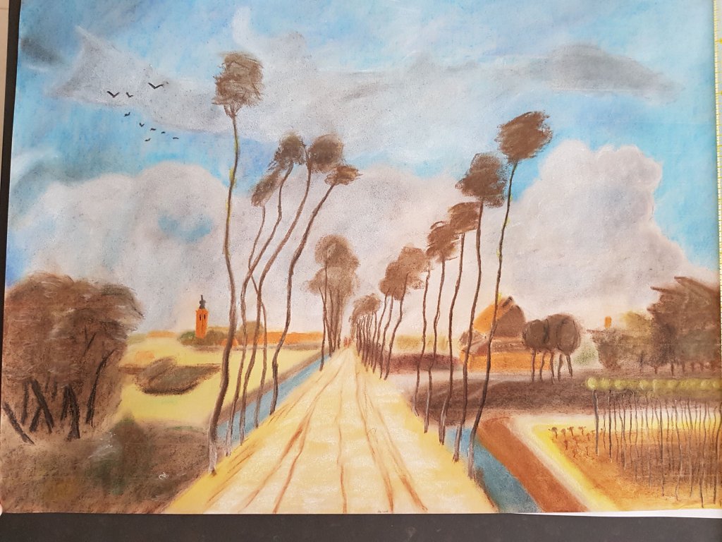 Dochter Rosanne heeft een tekencursus gevolgd en 1 van de opdrachten was een bestaand schilderij na te maken. Zij maakte het Laantje van Middelharnis van Meindert Hobbema met soft pastel krijt en ik kreeg het van haar. Ik vind het heel goed gelukt, ook de kleuren vind ik erg mooi.