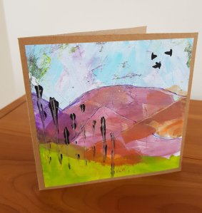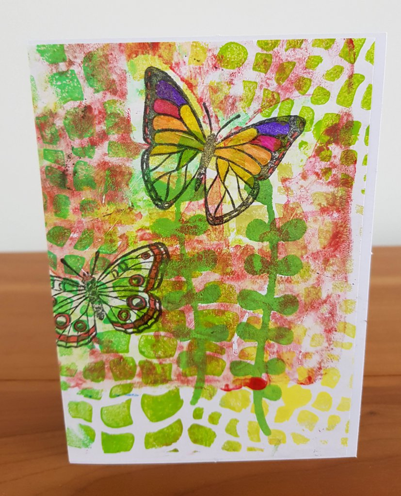 Bij de goedkope winkel heb ik weer een stapeltje dubbele kaarten met enveloppen gekocht zodat ik weer nieuwe kaarten kan maken. Meestal print ik eerst op papier wat ik daarna op een kaart plak, soms print ik rechtstreeks op de kaart. Ik heb weer gewerkt met stencils en stempels, de stempels van de vlinders heb ik gedeeltelijk ingekleurd met gelpennen, de print loopt een beetje door op de achterkant van de kaart.