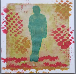 Ik kijk veel filmpjes van de gelli plate op youtube of via blogs en zie telkens weer nieuwe mogelijkheden. Een ronde vorm is ook wel eens leuk, maar omdat ik geen ronde gelli plate heb heb ik er gewoon een rondje uitgeknipt.