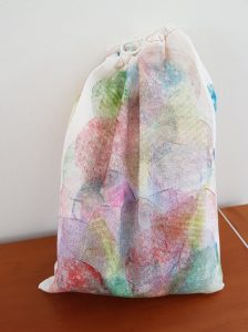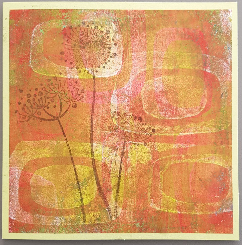 Het tasje heb ik ook bedrukt met behulp van kleine gelli plates, een ronde en een driehoekige.