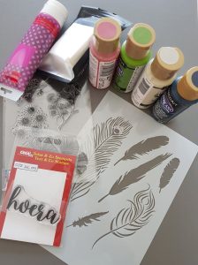 Mijn zus is al net zo verslingerd aan de gelli plate als ik, daarom voor haar verjaardag een tasje samengesteld met verf en wat sjabloontjes en stempels. Natuurlijk ook een kaart erbij.