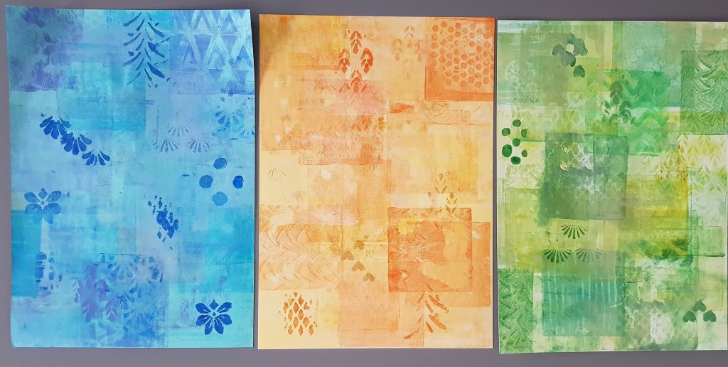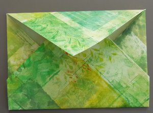 Bij Mieke zag ik dat ze vaak zelf haar enveloppen maakt en dat leek me ook wel leuk. Ik heb wat grotere vellen bedrukt met de gelli plate en van de groene heb ik een envelop gemaakt.