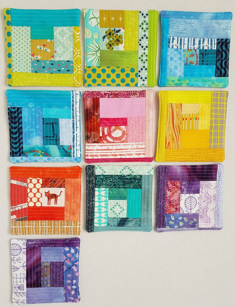 Gisteren was de eerste bijeenkomst van het nieuwe seizoen van onze quiltgroep en tevens de laatste keer dat ik aanwezig was. Een vreemd gevoel, ik ben vanaf het allereerste begin lid van de Torenquilters, dat is zo’n 26 jaar. De samenstelling van de groep is in die tijd behoorlijk veranderd, er zitten nu nog maar 3 leden van Goeree-Overflakkee op, maar het was altijd een leuke, gezellige en inspirerende groep, quiltsters zijn tenslotte leuke mensen! Gelukkig hebben zich weer een paar nieuwe leden aangemeld en beginnen de dames weer met het voorbereiden van een nieuw thema. Voor alle leden had ik een onderzetter gemaakt en ingepakt met een labeltje eraan.