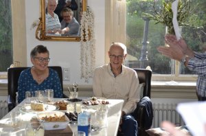 Afgelopen zaterdag gingen we nietsvermoedend bij Riekje op de koffie, toen we de kamer binnen kwamen stonden daar 16 mensen ons op te wachten, leden van de kerkenraad met aanhang en de dominee. Wat een verrassing hadden ze voor ons georganiseerd! Eerst kregen we koffie en thee met gebak, Riekje had zelfs suikervrije taarten gebakken voor Aat, daarna kregen we allerlei toespraken, wijn en bloemen en er werd zelfs een lied voor ons gezongen.