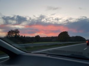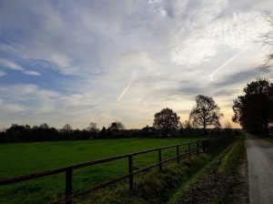 We liepen de tocht van 30 km die volgens de beschrijving 31,6 km was, maar door het verkeerd lopen kwamen wij precies op 35 km, dus was het best al laat toen we bij de finish kwamen. Terug naar huis zagen we deze prachtige lucht.