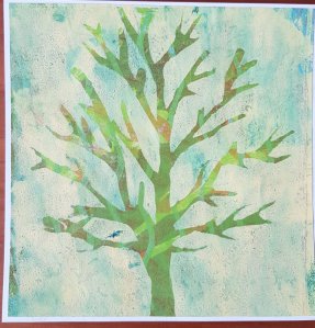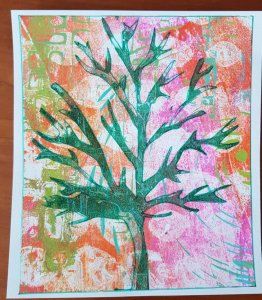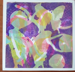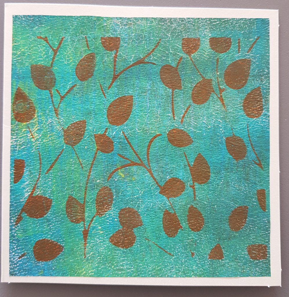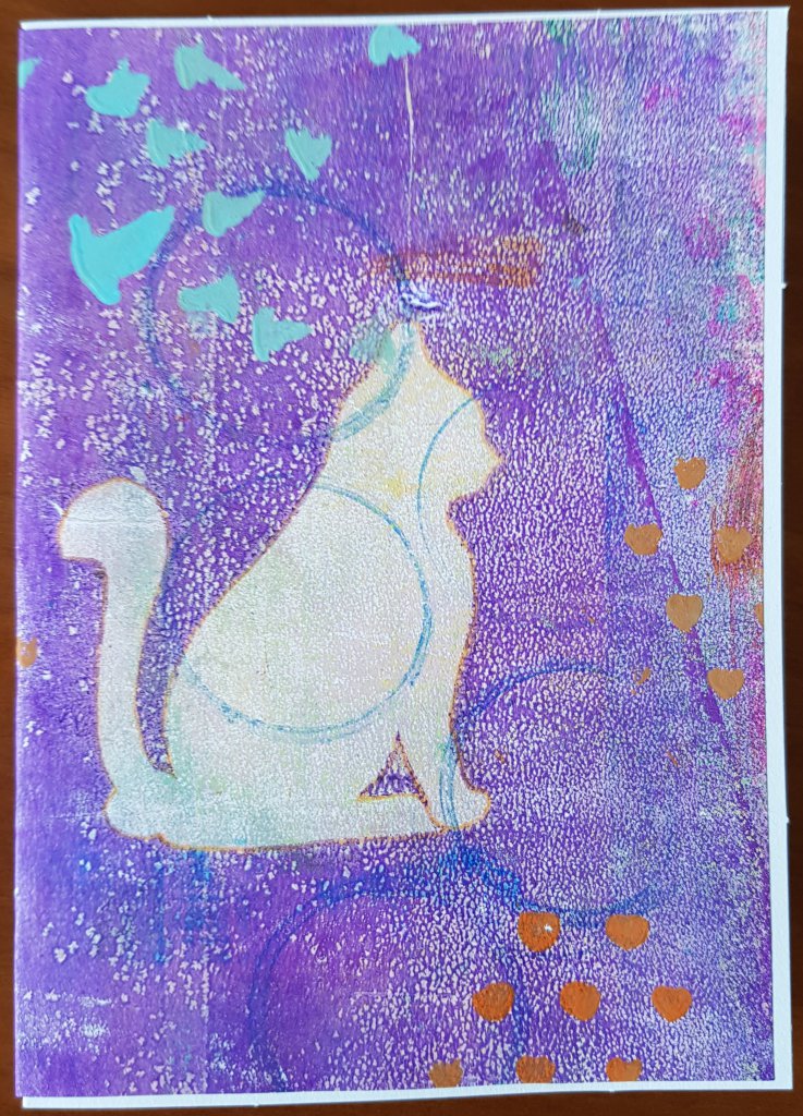 Nu we noodgedwongen veel binnen moeten zitten haal ik vaak ’s middags mijn hobbyspullen tevoorschijn. Ik had nog heel wat vellen liggen die al geprint waren met de gelli plate en heb daarvan weer wat kaarten gesneden. Ook heb ik nog nieuwe kaarten gemaakt. Vaak heb ik een idee in mijn hoofd, maar dan wordt het heel anders, ook leuk maar anders, soms wordt het precies zoals ik bedoeld had en soms doe ik maar wat en zie wel wat het wordt.