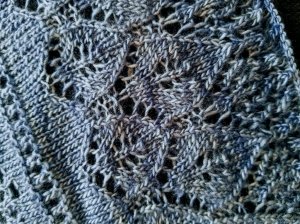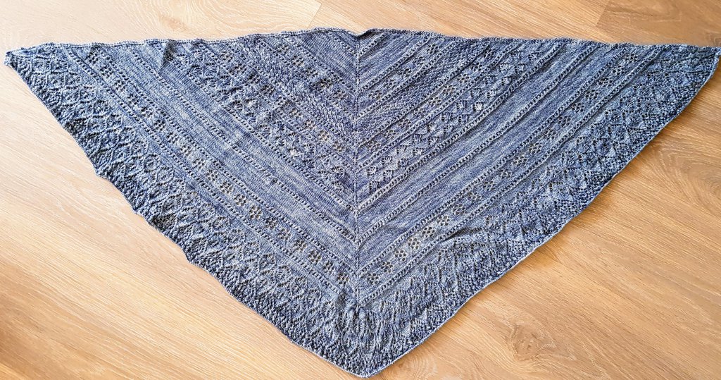 Omdat ik het breien zo leuk vond heb ik ook nog een omslagdoek gemaakt van merinowol op naalden nr. 2,5. Het patroon heb ik wat aangepast omdat deze voor dikkere wol en naalden was, ik heb er wat rijen tussengevoegd, anders werd het wel erg klein. Op het laatst had ik zo’n 550 steken op de naald, het was dus niet even snel een naaldje breien!