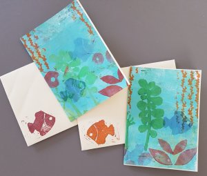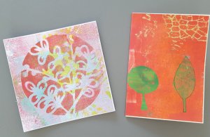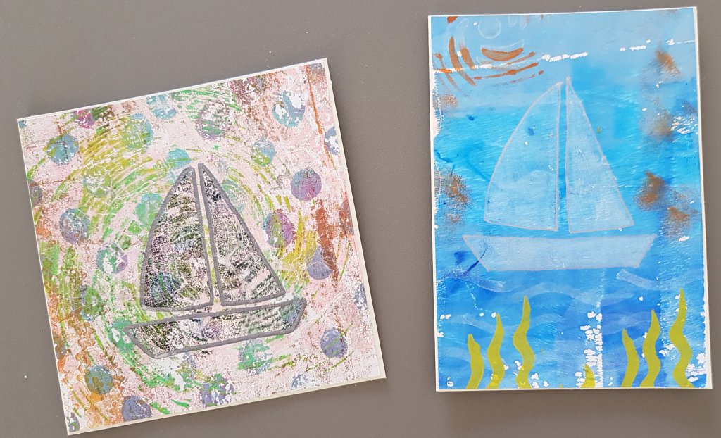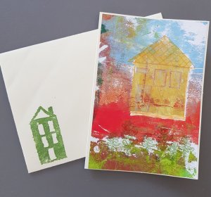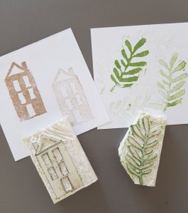 Van gummetjes heb ik wat stempeltjes gemaakt om in combinatie met de gelli plate te gebruiken. Eerst breng je de afbeelding over op het gummetje, dat gaat heel makkelijk als je een tekening met potlood maakt, je legt hem ondersteboven op de gum en wrijft de afbeelding erop. Snijd met een guts of mesje weg wat niet afgedrukt moet worden.